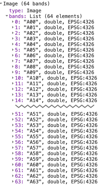 Вы увидите, что изображение содержит 64 полосы, обозначенные как A00, A01, …, A63. Каждая полоса содержит значение вектора эмбедирования для заданного года в соответствующем измерении или оси. В отличие от спектральных полос или индексов, отдельные полосы не имеют самостоятельного значения — каждая полоса представляет одну ось пространства эмбедирования. Вы можете использовать все 64 полосы в качестве входных данных для ваших последующих приложений.