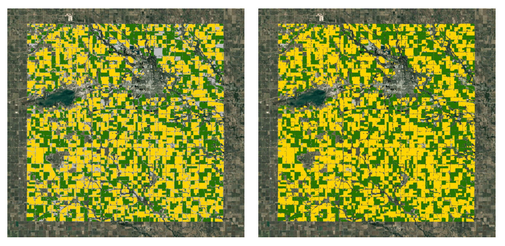 Ilustracja: (po lewej) wycinek mapy z osadzonych danych satelitarnych, (po prawej) wycinek mapy z danych CDL
