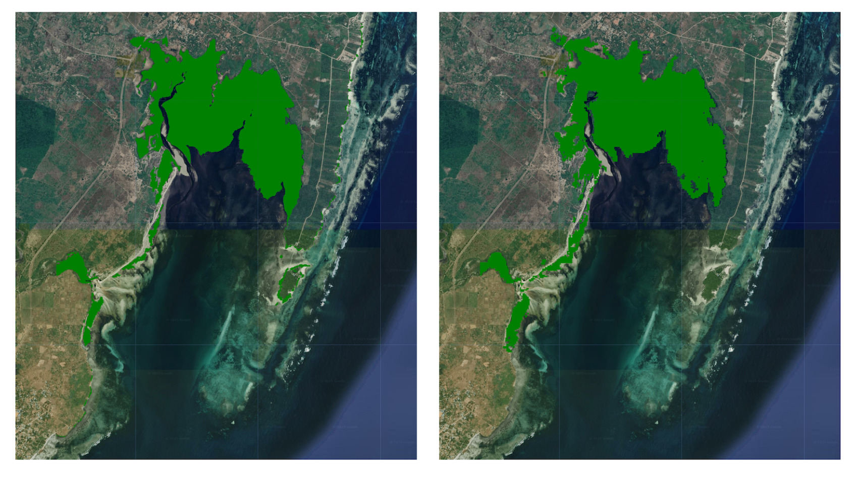 Figure : (à gauche) carte des mangroves à partir d'intégrations satellite, (à droite) carte des mangroves à partir de GMW
