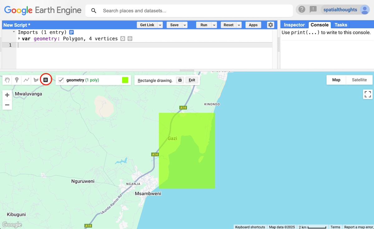 관심 영역을 정의하는 것부터 시작해 보겠습니다. 이 튜토리얼에서는 케냐 해안선을 따라 리전을 선택하고 다각형을 형상 변수로 정의합니다. 또는 코드 편집기의 그리기 도구를 사용하여 관심 영역 주위에 다각형을 그릴 수 있습니다. 이 다각형은 가져오기에서 geometry 변수로 저장됩니다.