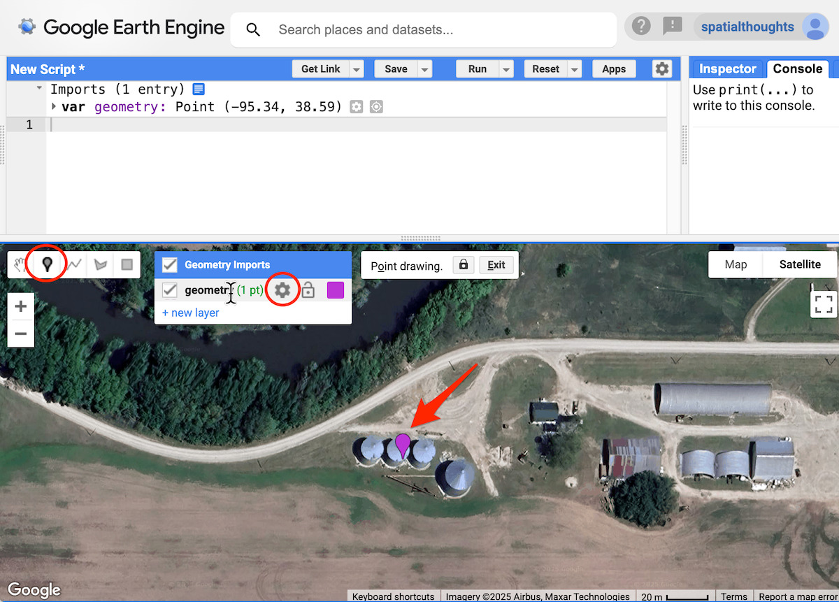 Chúng tôi bắt đầu bằng cách đánh dấu vị trí của một hoặc nhiều hầm chứa ngũ cốc. Trong Trình chỉnh sửa mã, bạn có thể sử dụng bản đồ cơ sở vệ tinh để dễ dàng xác định vị trí của các đối tượng.