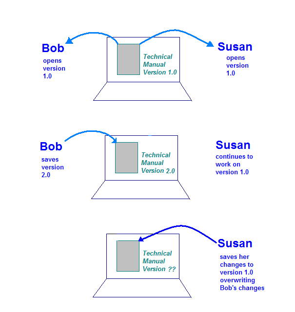 Hình minh hoạ này cho thấy vấn đề có thể xảy ra nếu không có chế độ kiểm soát trên một bản sao của hướng dẫn kỹ thuật. Khi Susan lưu những thay đổi của mình, cô ấy sẽ ghi đè những nội dung do Bob tạo.
