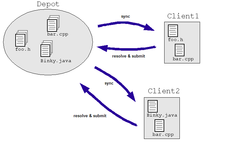 Hãy xem xét một ví dụ đơn giản trong lĩnh vực kỹ thuật: Giả sử chúng ta cho phép các kỹ sư sửa đổi đồng thời cùng một tệp trong kho lưu trữ mã nguồn trung tâm. Cả Client1 và Client2 đều cần phải thực hiện các thay đổi đối với tệp cùng một lúc: