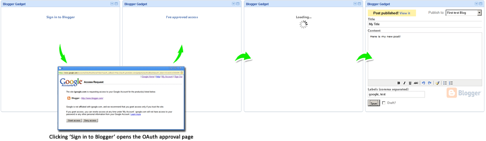 response.oauthApprovalUrl) ที่เราจะส่งผู้ใช้ไปเพื่อเข้าสู่ระบบ แกดเจ็ตจะแสดง "ลงชื่อเข้าใช้ Blogger" และตั้งค่า href เป็นค่าของoauthApprovalUrl - จากนั้นผู้ใช้จะคลิก "ลงชื่อเข้าใช้ Blogger" และหน้าการอนุมัติ OAuth จะเปิดขึ้นในหน้าต่างแยก แกดเจ็ตจะรอให้ผู้ใช้ดำเนินการอนุมัติให้เสร็จสิ้นโดยแสดง ลิงก์ "ฉันอนุมัติการเข้าถึงแล้ว"
