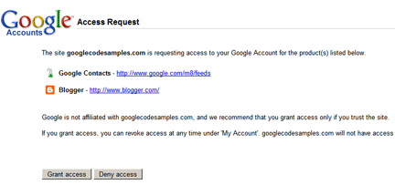 Passaggio 1: scegli gli ambitiInnanzitutto, decidi quali API vuoi utilizzare scegliendo uno o più ambiti. In questa dimostrazione, richiedo un token che funzioni con Blogger e Contatti Google. Somiglianza con AuthSub: |