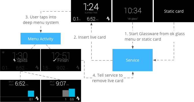 باستخدام عناصر واجهة المستخدم الرئيسية إلى جانب طريقة الاستدعاء، يمكنك إنشاء مجموعة متنوعة من أنماط الاستخدام التي تعمل بشكل جيد على Glass. يمكنك بعد ذلك دمج أنماط متعددة معًا في Glassware لحالات الاستخدام التي تحتاجها.