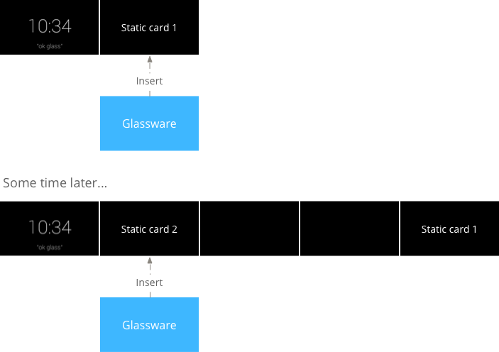 Utilizzando i principali elementi dell'interfaccia utente insieme a un metodo di chiamata, puoi creare un'ampia varietà di pattern di utilizzo che funzionano bene su Glass. Puoi quindi combinare più pattern insieme in Glassware per i casi d'uso di cui hai bisogno.