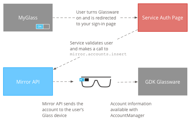 Wenn die Authentifizierung korrekt eingerichtet ist, verwendet die Mirror API, um die Kontoinformationen für Glass nachdem sie sich bei Ihrem Dienst authentifiziert haben.