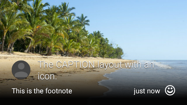 CardBuilderمع منحه التنسيق الذي تريده منCardBuilder.Layout - ضبط خصائص البطاقة، مثل النص والحاشية السفلية والطابع الزمني