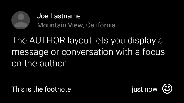 CardBuilder, zapewniając jej odpowiedni układ z:CardBuilder.Layout - Ustaw właściwości karty, takie jak tekst, przypis i sygnatura czasowa.