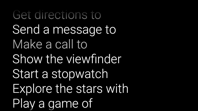 getWindow().requestFeature(WindowUtils.FEATURE_VOICE_COMMANDS)dans l'activité souhaitée pour activer les commandes vocales contextuelles. Grâce à cette fonctionnalité, le menu OK Glass apparaît dans le pied de page de l'écran. chaque fois que cette activité est ciblée.Ignorer