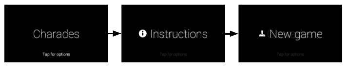 Charades utilizza il comando vocale Gioca . Dopo che gli utenti hanno richiamato il comando vocale, viene visualizzata la schermata iniziale di Charades, che chiede agli utenti di Toccare per altre opzioni (Nuovo gioco o Istruzioni in questo caso).