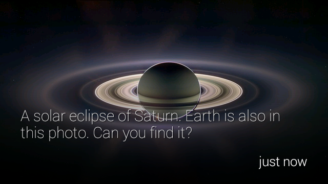 { "text": "A solar eclipse of Saturn. Earth is also in this photo. Can you find it?" }