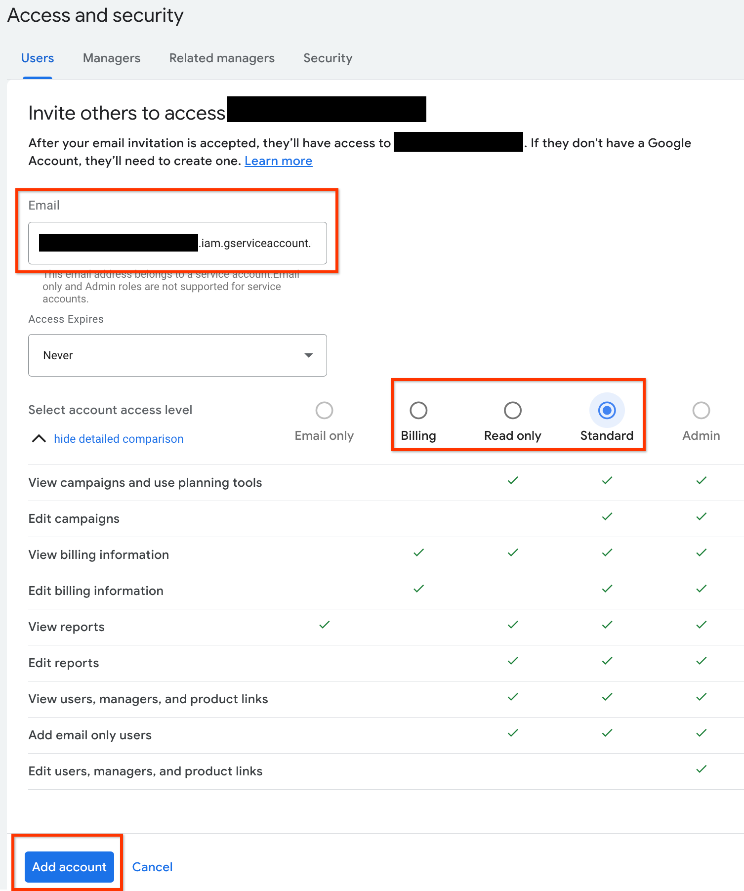 Seleziona il livello di accesso all'account appropriato e fai clic sul pulsante