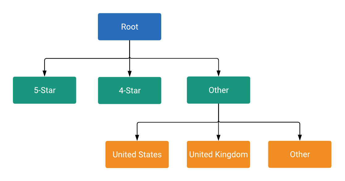 飯店廣告群組支援將飯店劃分為多個飯店房源群組, 並依據多個維度調整各群組的出價。 請參考下方的樹狀結構,第一層的飯店已大致分為 5 星級飯店、4 星級飯店和其他星級飯店。在第二層級,其他飯店類別的飯店已劃分為「美國」飯店、「英國」飯店和其他地區的飯店。