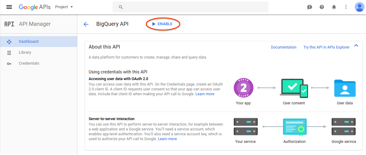 프로젝트에 대해 사용 설정된 API 목록을 보려면 대시보드 페이지를 선택합니다. 스크립트에 사용할 모든 고급 API가 나열되어 있는지 확인합니다.