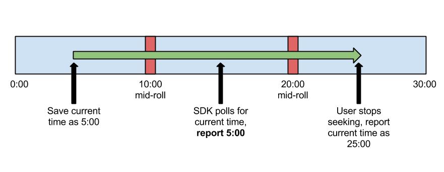 Zapisz bieżący czas, gdy użytkownik zacznie przewijać, i zgłaszaj ten czas, gdy pakiet SDK o to poprosi, dopóki użytkownik nie wznowi normalnego odtwarzania. Ilustrację tego rozwiązania znajdziesz na tym diagramie: