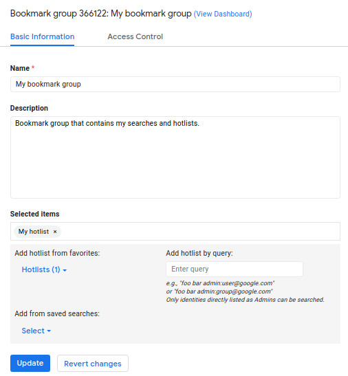 Grupa zakładek w Google Issue Tracker to kolekcja list gorących tematów i zapisanych wyszukiwań. Grupy zakładek umożliwiają zbieranie i śledzenie zestawów problemów. Grupy zakładek to też wygodny sposób na współpracę w ramach całych projektów lub produktów.