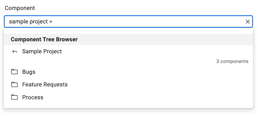 เครื่องมือติดตามปัญหาจะแสดงเครื่องมือค้นหาคอมโพเนนต์ในทุกที่ที่คุณระบุคอมโพเนนต์ได้ในอินเทอร์เฟซผู้ใช้ เมื่อคุณป้อนคีย์เวิร์ดที่เชื่อมโยงกับเส้นทางหรือคำอธิบายคอมโพเนนต์ เครื่องมือจะเริ่มการค้นหาคอมโพเนนต์โดยอัตโนมัติและแสดงผลการค้นหาที่จัดอันดับในรายการแบบเลื่อนลง ระบบจะกําหนดการจัดอันดับโดยใช้คะแนนการจับคู่ข้อความและความนิยมร่วมกัน