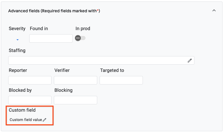 Pola niestandardowe w Google Issue Tracker to pola, które mogą być dostępne dla poszczególnych komponentów oprócz standardowych polów domyślnych. Pola niestandardowe są tworzone przez pracowników Google, którzy są odpowiedzialni za zarządzanie komponentami. Użytkownicy z grupy publicznej i partnerzy nie mogą tworzyć pól niestandardowych ani zmieniać dostępnych pól niestandardowych.