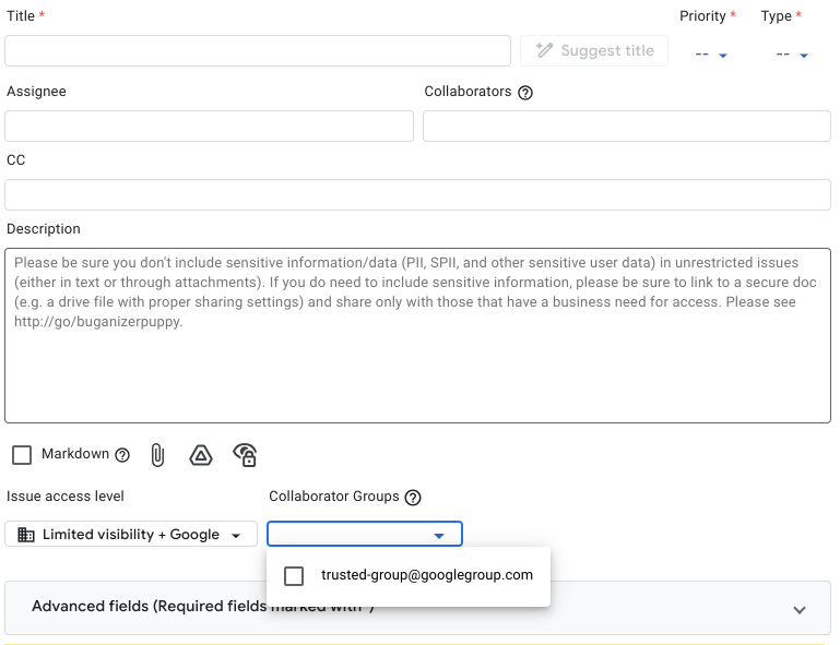 Como alternativa, los administradores de problemas pueden agregar grupos de colaboradores de confianza a los problemas en la página Crear problema: