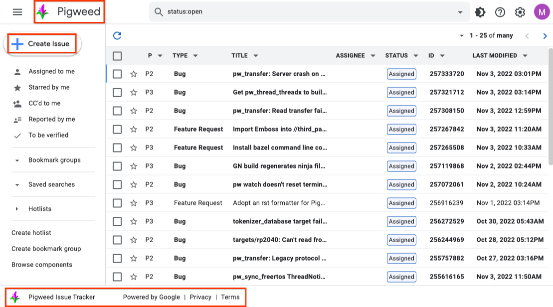Verás una instancia de marca de Issue Tracker de Google. Por ejemplo, el rastreador de Pigweed muestra el logotipo y el encabezado de Pigweed, botones temáticos de código abierto y un pie de página con el desarrollo de la marca de Pigweed.
