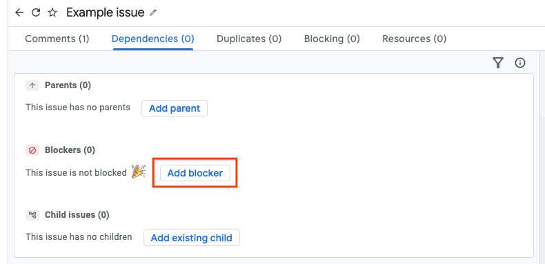 [ブロック] セクションと [ブロッカー] セクションのタイトルには、それぞれに含まれる問題の数が表示されます。/ の前の数字は未解決の問題の数で、/ の後の数字は問題の合計数です。たとえば、[ブロック] タブに 2/5 と表示されている場合、現在の問題をブロックしている問題は合計 5 件ありますが、そのうち解決されていない問題は 2 件のみです。