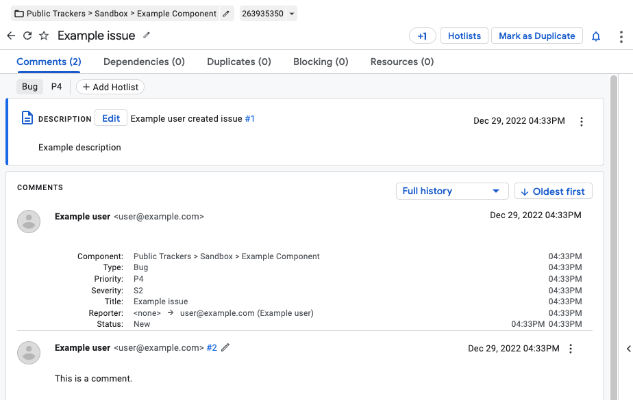 Para ver y editar problemas, debes acceder a una Cuenta de Google. También debes tener el permiso Editar problemas o Administrar problemas para el componente que contiene el problema para editar sus campos. Si tienes el permiso Comentar problemas, solo puedes ver los problemas y agregar comentarios a ellos.