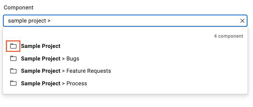 Na przykład w przypadku wpisu o hierarchii Przykładowy projekt > Błędy możesz wybrać element Błędy, klikając dowolną ogólną część wpisu. Aby wybrać komponent Przykładowy projekt, kliknij Przykładowy projekt.