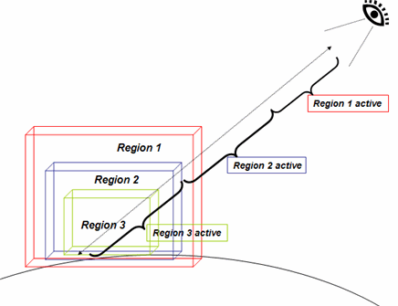 A common use of Regions is to nest them, with the larger Regions associated with coarser resolution, and the smaller, inside Regions associated with increasingly finer levels of detail. In the following figure, each Region has a set of LOD limits that specify the projected screen size of the Region in pixels that is required for the associated Region to be active. As the user's viewpoint moves closer, Regions with finer level of detail (LOD) become active because the Region takes up more screen space. The Regions with finer LOD replace the previously loaded Regions with coarser LODs.