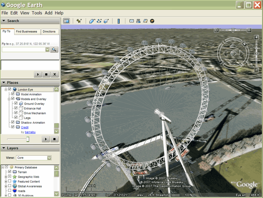 Another example of using the TimeSpan element is the animation of the London Eye, created by James Stafford . This display uses a model of the London Eye giant ferris wheel. The model is referenced in a series of Placemarks, each using a different incremental rotation for the model and a TimeSpan that indicates how long to display that Placemark.