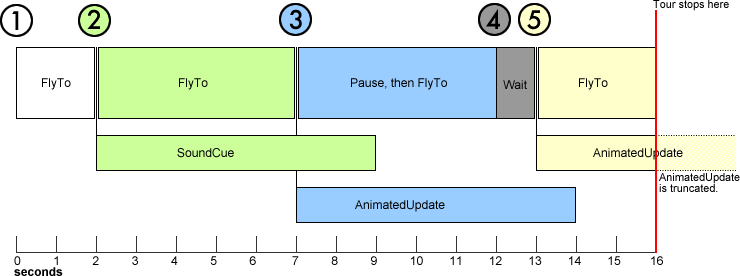 Diagram berikut mengilustrasikan perilaku primitif tur di sepanjang linimasa. Kode yang mewakili setiap bagian berwarna disertakan di bawah diagram untuk referensi. Halaman ini ditautkan dari bagian Linimasa tur di bab Tur pada Panduan Developer KML.