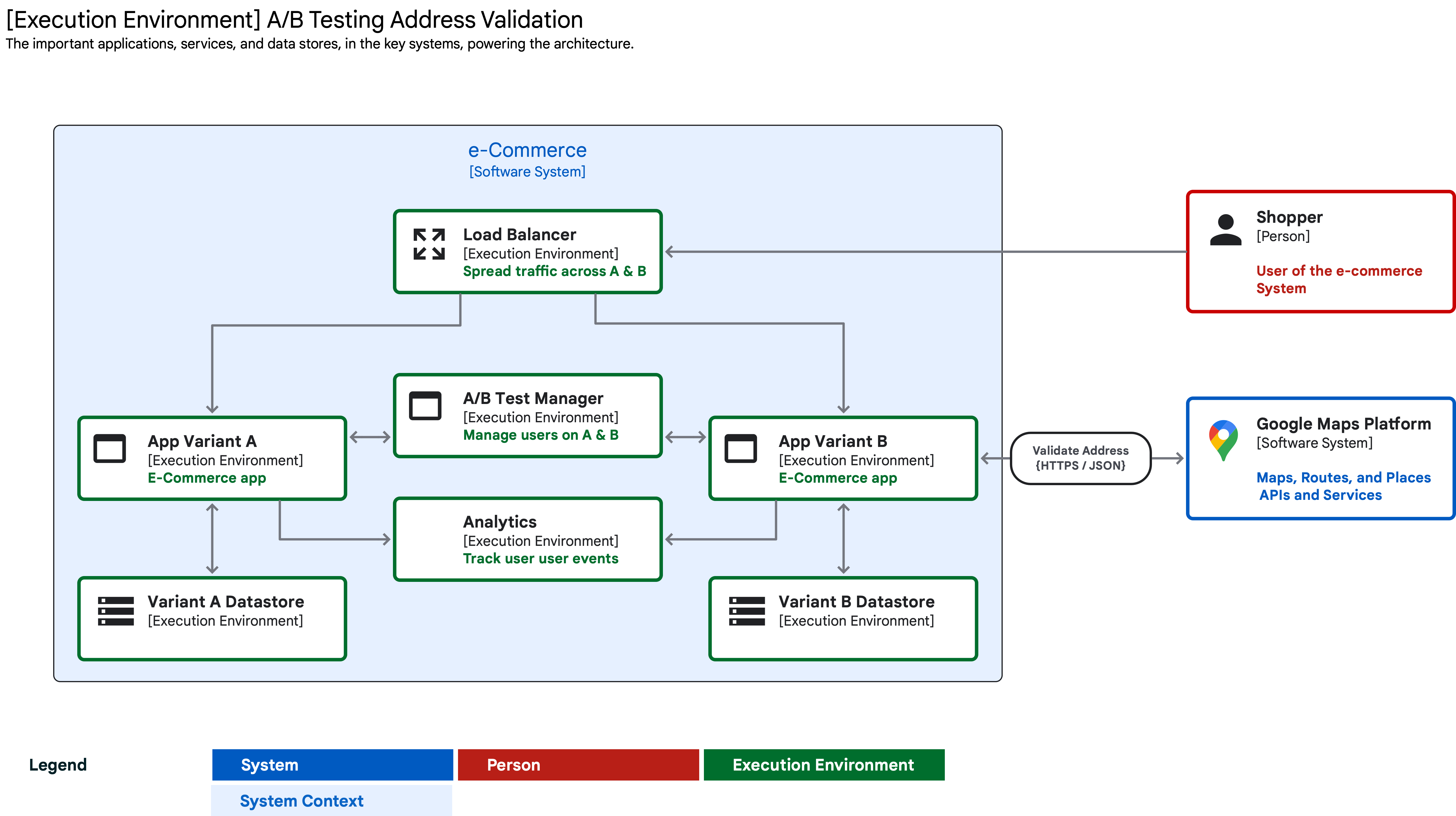มาดูการทดสอบ A/B การตรวจสอบที่อยู่ในกรณีการใช้งานอีคอมเมิร์ซกัน แผนภาพสถาปัตยกรรมด้านล่างแสดงวิธีที่ลูกค้าโต้ตอบกับประสบการณ์การซื้อขายของคุณ ซึ่งจะช่วยให้คุณกำหนดกลยุทธ์การตรวจสอบที่มีประสิทธิภาพมากขึ้นได้