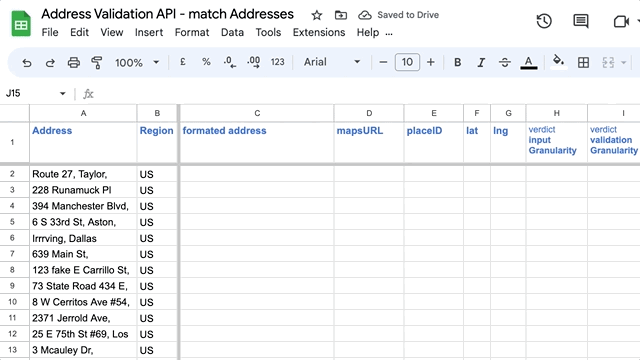 Rozwiązanie to Arkusz Google z niestandardowymi funkcjami Apps Script, które wykonują żądania w sekwencji do interfejsu Address Validation API.