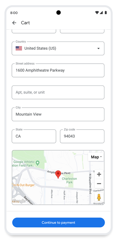 Este documento apresentou uma visão geral de um fluxo de finalização de compra que implementa preenchimento automático, validação de endereço e confirmação visual em um mapa do Google. Use este documento como ponto de partida para projetar sua implementação, seguindo os fluxos de entrada de endereço recomendados.