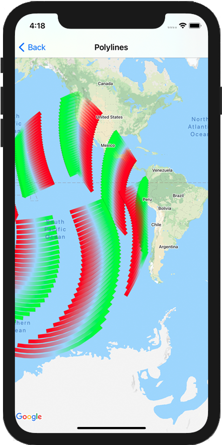 As polilinhas permitem desenhar linhas no mapa. Um objeto GMSPolyline representa uma sequência ordenada de locais, mostrada como uma série de segmentos de linha. É possível definir a cor de uma polilinha com