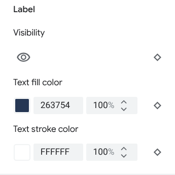 Für Kartenelementtypen, die vollständig oder teilweise durch ein Label dargestellt werden (z. B. „POIs“ oder „Verkehr“), können Sie normalerweise die folgenden Elemente gestalten: „Sichtbarkeit“, „Symbolfarbe“, „Textfüllfarbe“ und „Textstrichfarbe“.