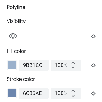 • Lebar goresan: Ketebalan garis batas untuk poligon dan polyline. Hasil dapat bervariasi bergantung pada tingkat zoom. Jika Anda tidak menginginkan garis batas, tetapkan Warna goresan agar sama dengan Warna pengisi, atau tetapkan lebar Goresan ke 0.