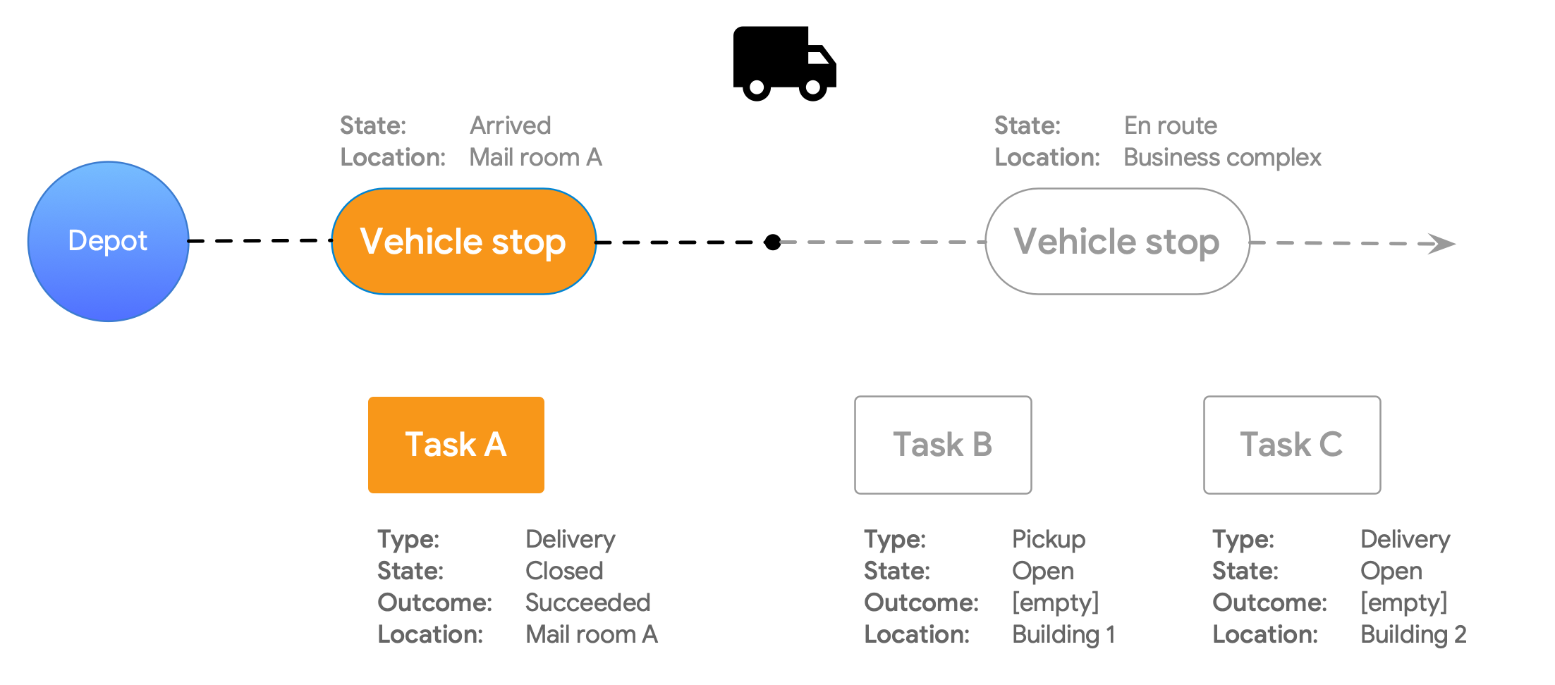 - Reasignación de tareas: No puedes reasignar directamente una tarea a un vehículo diferente. En su lugar, para mover una tarea de un vehículo a otro, cierra la tarea original y vuelve a crearla antes de asignarle el vehículo nuevo. Si actualizas el orden de una tarea que ya está asignada a un vehículo diferente, Fleet Engine muestra un error.