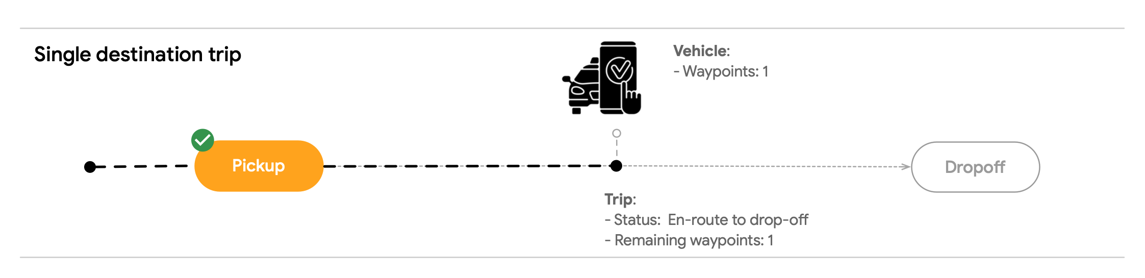 remaining_waypoints的欄位。其中包含車輛必須依序前往的路線點,才能抵達行程的最終下車點。請參閱「行程情境」中的情境。- 對於指派給車輛的單一目的地行程,且該車輛在其行程表中沒有其他行程,則只會包含上車和下車地點,假設車輛未離開上車路徑點。