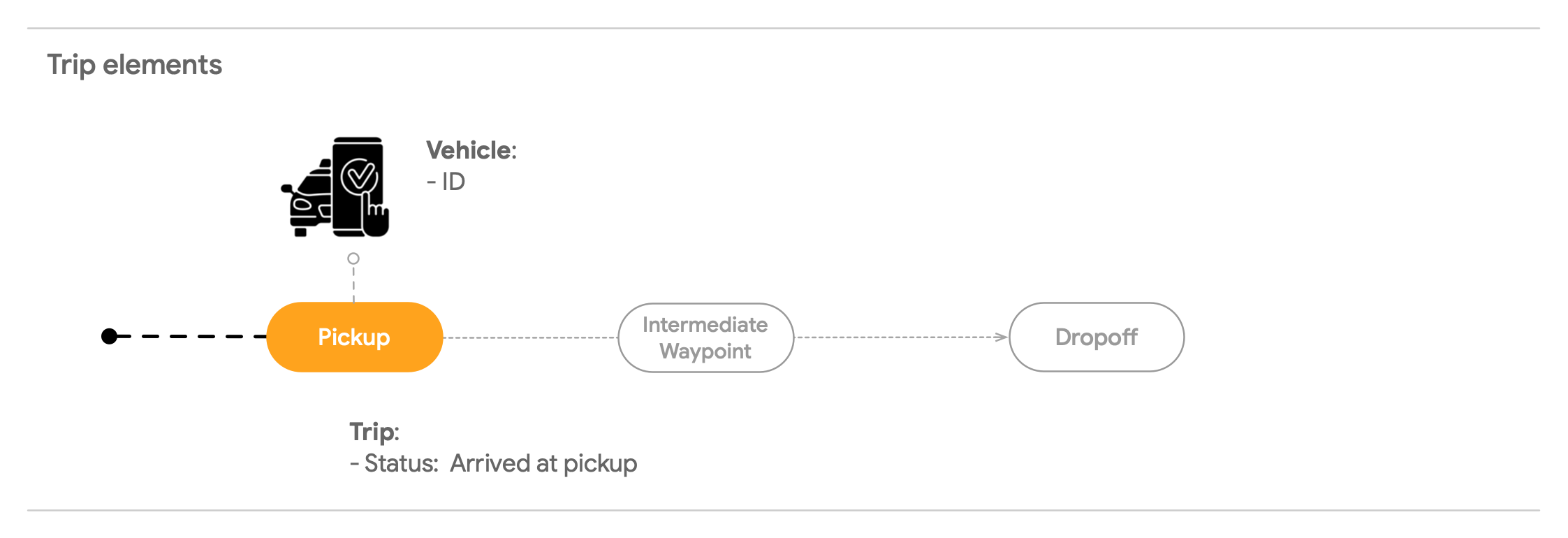 L'illustrazione seguente mostra gli elementi di base di un viaggio: l'ID del veicolo assegnato, lo stato del viaggio e i waypoint del viaggio. I tipi di waypoint variano a seconda della fase del viaggio: partenza, intermedio e arrivo. In qualsiasi viaggio, una destinazione o un waypoint intermedio è facoltativo. Nell'esempio dell'immagine, il veicolo è arrivato al luogo di ritiro