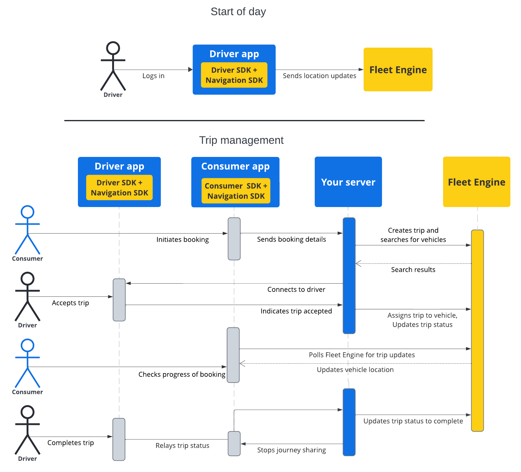 Aşağıdaki diyagramda, talep üzerine yolculukların iki temel bölümü gösterilmektedir: sürücülerin Fleet Engine ile Konum Paylaşımı'nı etkinleştirdiği günün başlangıcı ve Fleet Engine bileşenleri kullanılarak yolculuk yönetiminin basitleştirilmiş görünümü. Seyahat sürecinin ayrıntılı görünümü için Seyahat nedir? başlıklı makaleyi inceleyin. İsteğe bağlı geziler dokümanında.