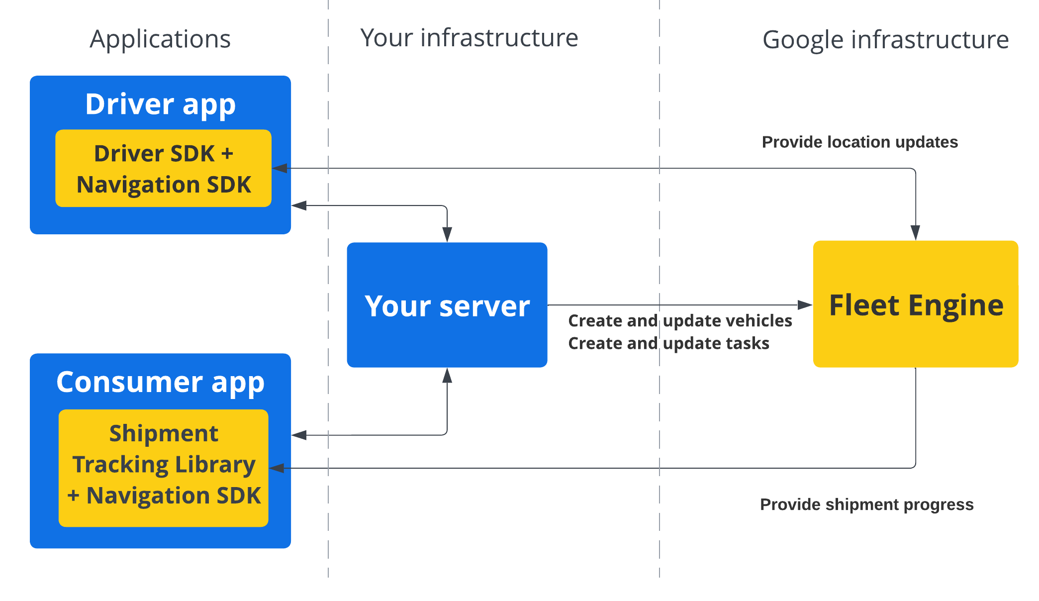 - Driver SDK: オンデマンドとスケジュール設定されたタスクの両方で、Driver SDK は基本コンポーネントです。Driver SDK はドライバー アプリと統合され、Fleet Engine に位置情報の更新ストリームとルート情報を提供します。Fleet Engine は、この情報を使用して、移動のリアルタイム ステータス(到着予定時刻や交通データなど)をレポートします。