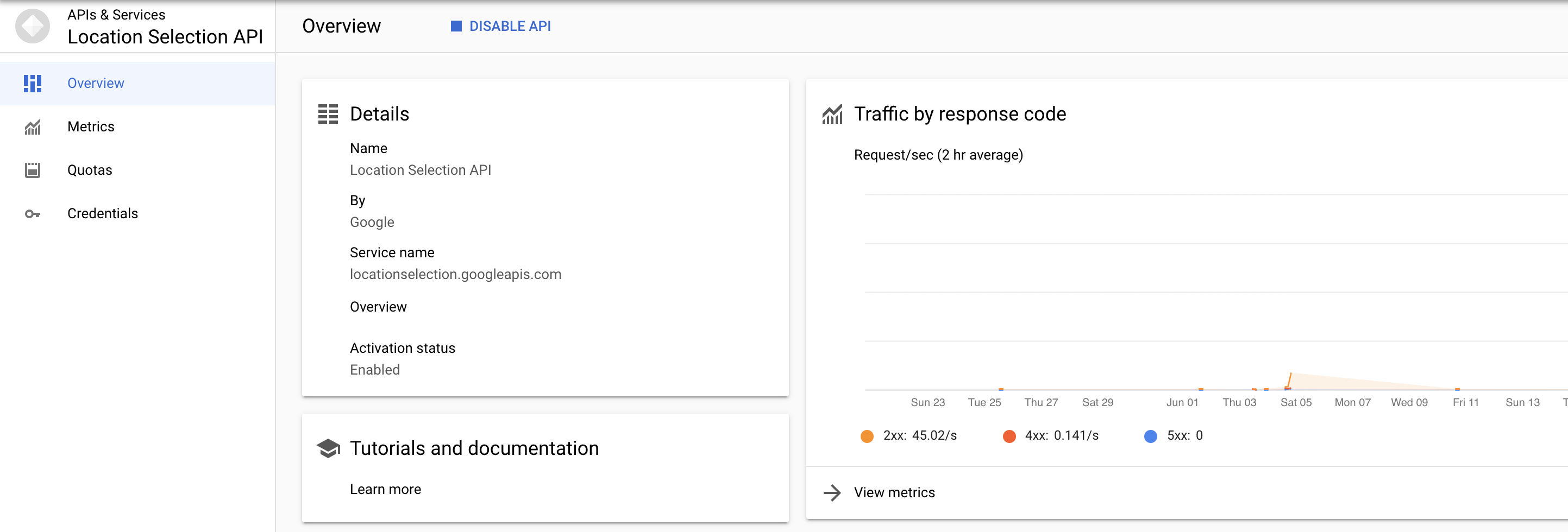 अपने प्रोजेक्ट के इस्तेमाल की रिपोर्ट देखकर, यह देखा जा सकता है कि आपका ऐप्लिकेशन Location Selection API का इस्तेमाल कैसे कर रहा है.
