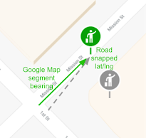 Navigation SDK は、経由地に最も近い道路セグメントを選択します。この道路セグメントの車線方向は、経由地がある道路の側面に沿っています(± 55 度以内)。