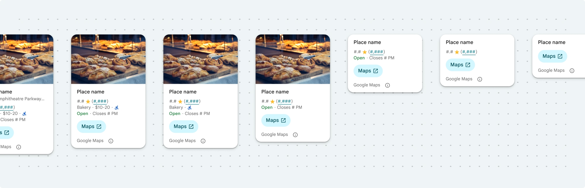 O fragmento compacto do Place Details (PlaceDetailsCompactFragment) renderiza detalhes de um lugar selecionado usando o mínimo de espaço. Isso pode ser útil em uma janela de informações que destaca um lugar em um mapa, em uma experiência de mídia social, como compartilhar um local em um chat, como uma sugestão para selecionar seu local atual ou em um artigo de mídia para referenciar o lugar no Google Maps.