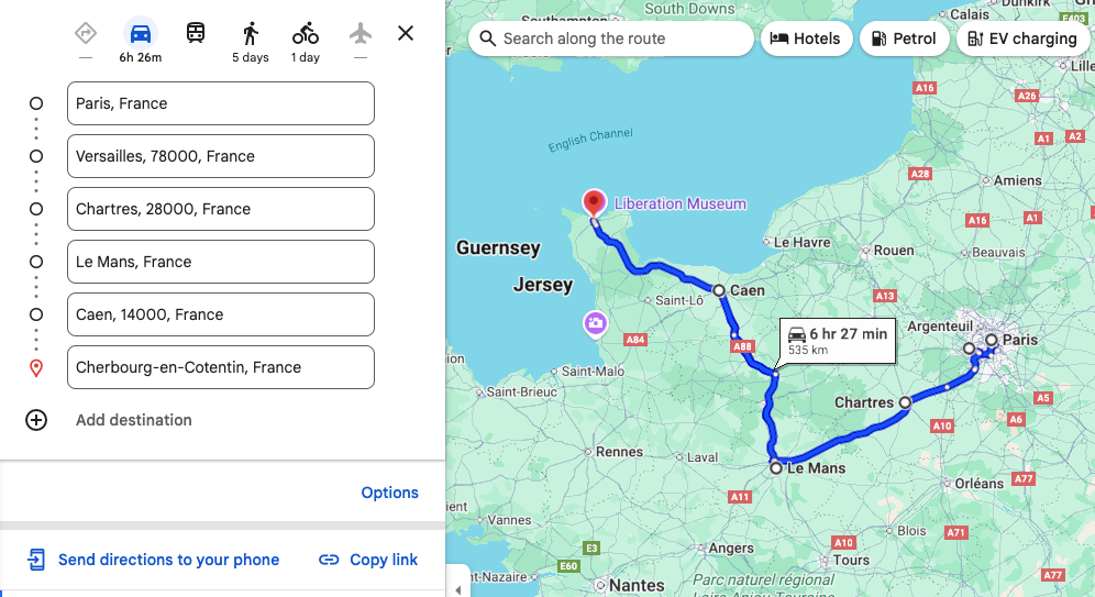 ตัวอย่างเส้นทางต่อไปนี้จะเปิด Google Maps และแสดงเส้นทางขับรถจากปารีส ฝรั่งเศส ไปยังเชอร์บูร์ก ฝรั่งเศส โดยกำหนดเส้นทางผ่านจุดแวะพักต่อไปนี้