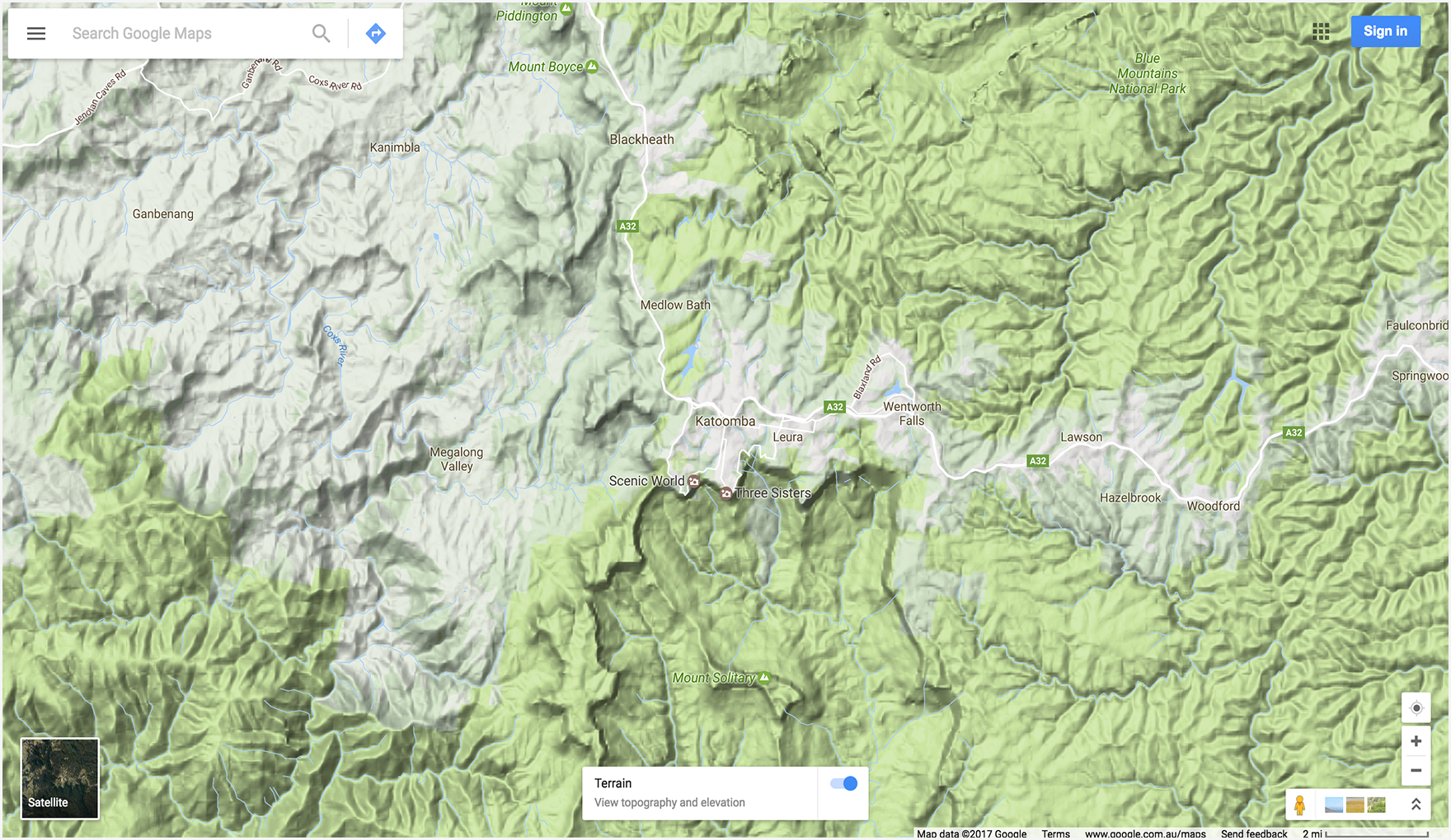 ตัวอย่างต่อไปนี้แสดงแผนที่ที่กําหนดให้ศูนย์กลางอยู่ที่ Katoomba, NSW, ออสเตรเลีย (ที่ -33.712206,150.311941) และตั้งค่าพารามิเตอร์ zoom และ basemap ที่ไม่บังคับ