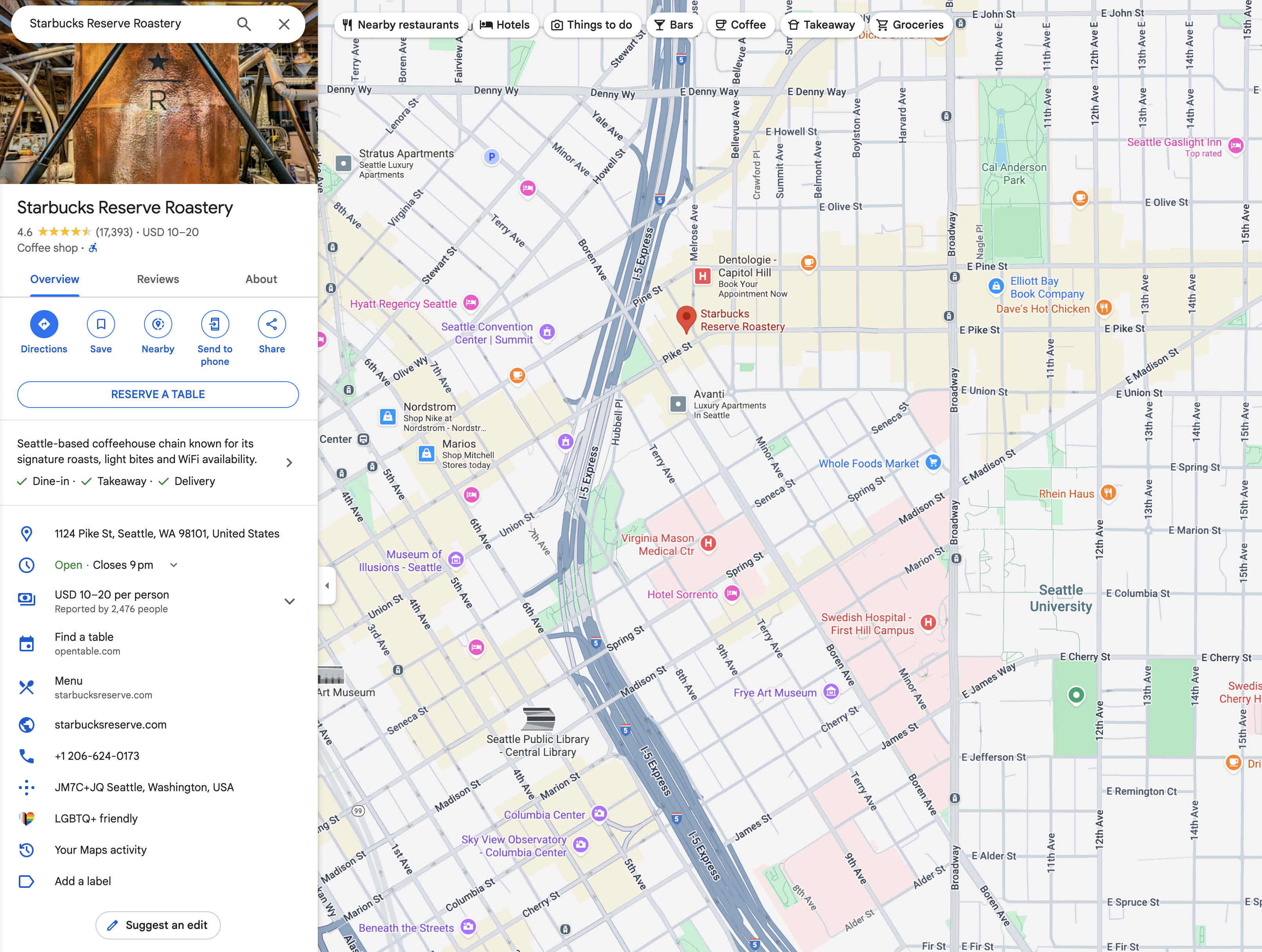 ในตัวอย่างนี้ การค้นหาร้านอาหารพิซซ่าในซีแอตเทิล รัฐวอชิงตันจะแสดงแผนที่ต่อไปนี้