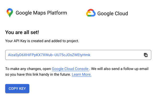 El widget de inicio rápido de Google Maps Platform es una forma segura de configurar tu cuenta con Google (si aún no lo hiciste) y obtener una clave de API para usarla con complementos de Google Maps Platform en plataformas de terceros como WordPress, Shopify, Magento y muchas más.